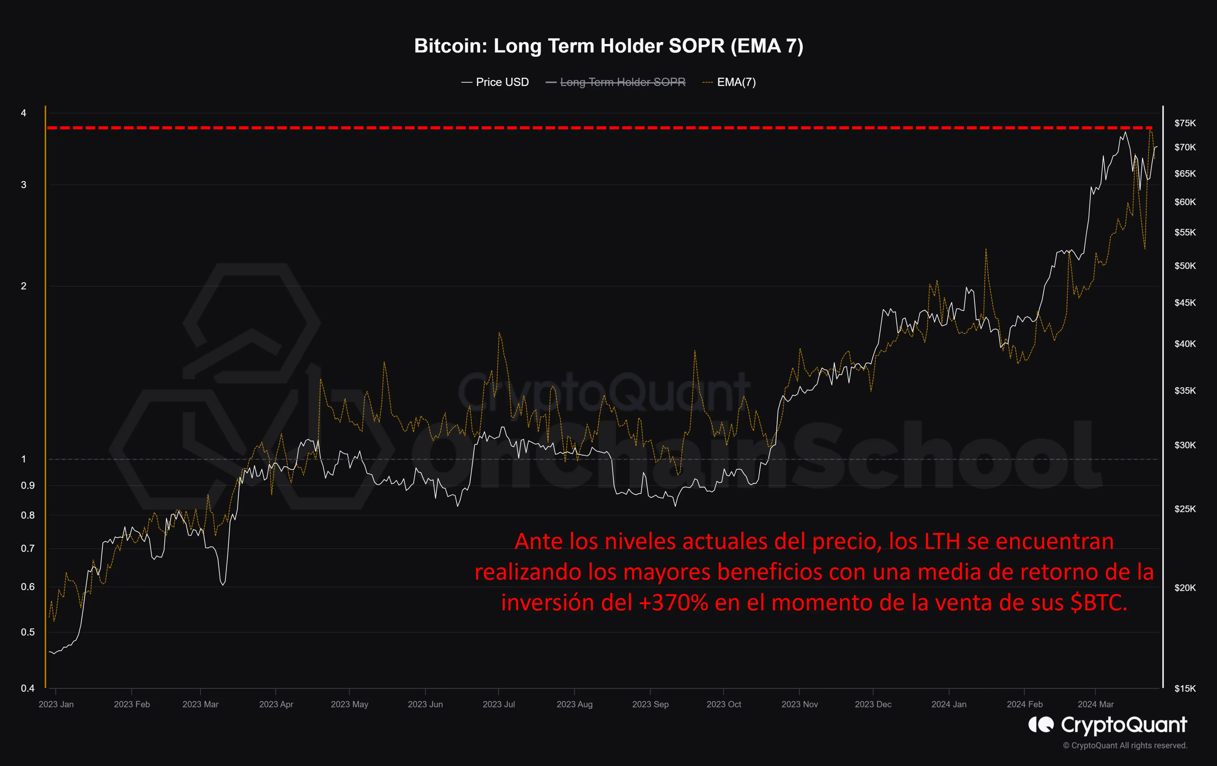 Y es que nos encontramos en el punto desde el suelo marcado a finales de 2022 en el que los Long Term Holders (LTH) están realizando los máximos beneficios, con unas ganancias medias de +370% en cada venta que realizan.