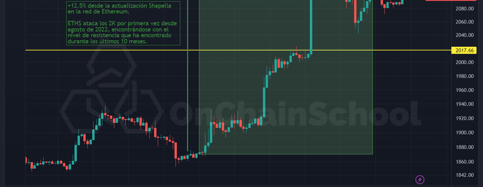 Después de la actualización Shapella en la red de Ethereum el pasado miércoles 12 de Abril, se ha generado un impulso en el precio de $ETH (+12,5% desde la actualización) que lo ha llevado directamente a la zona de 2K tras 243 días con valoraciones por debajo de este nivel.