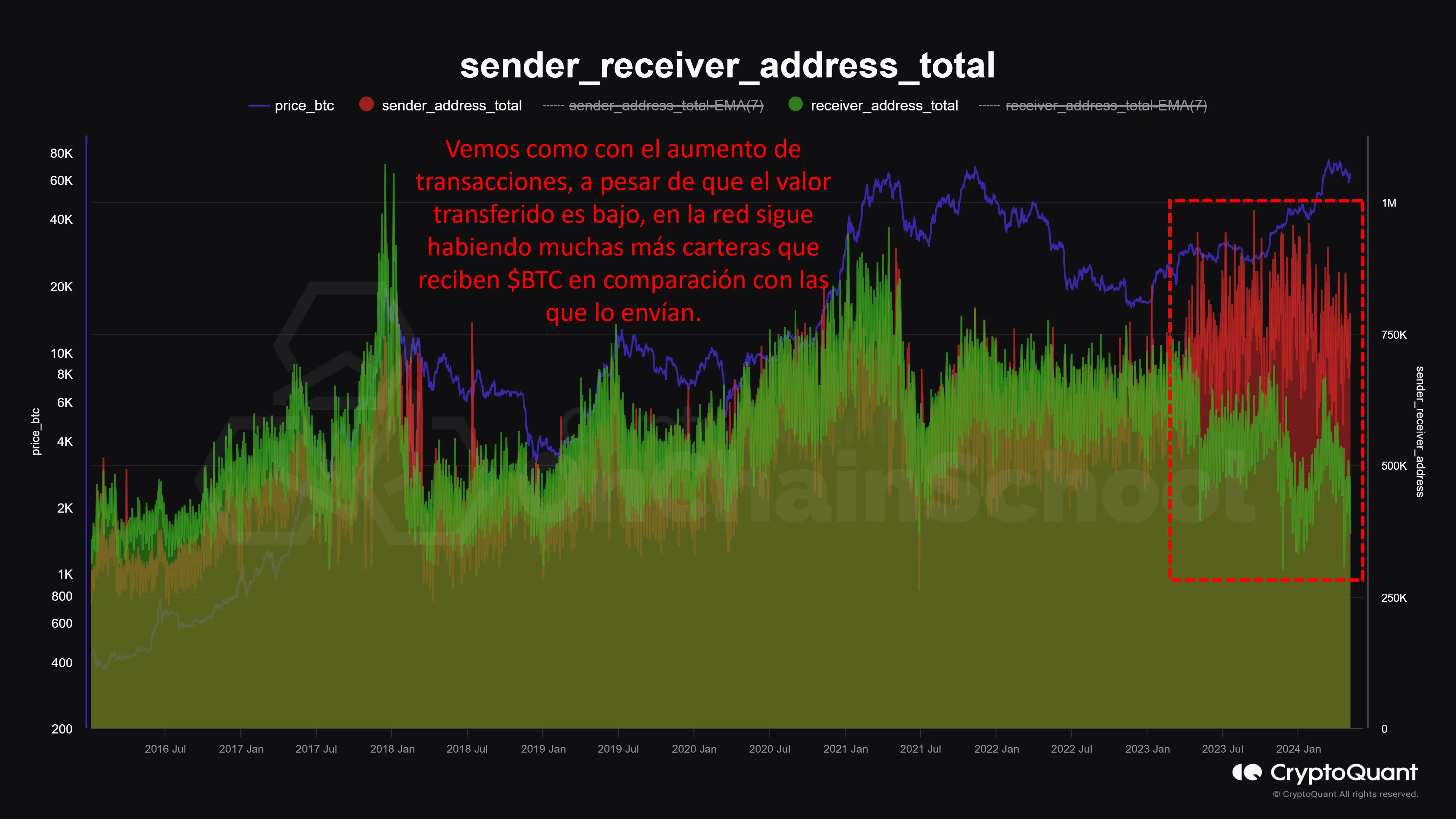Este descenso en el número de carteras únicas en la red puede haberse visto impulsado por un comportamiento "inusual" que vemos en la red de $BTC desde hace un año, en el que el número de carteras recibiendo tokens es mucho mayor que aquellas que envían. Esto nos podría hacer pensar que se está generando una distribución progresiva del supply a más carteras de forma progresiva.