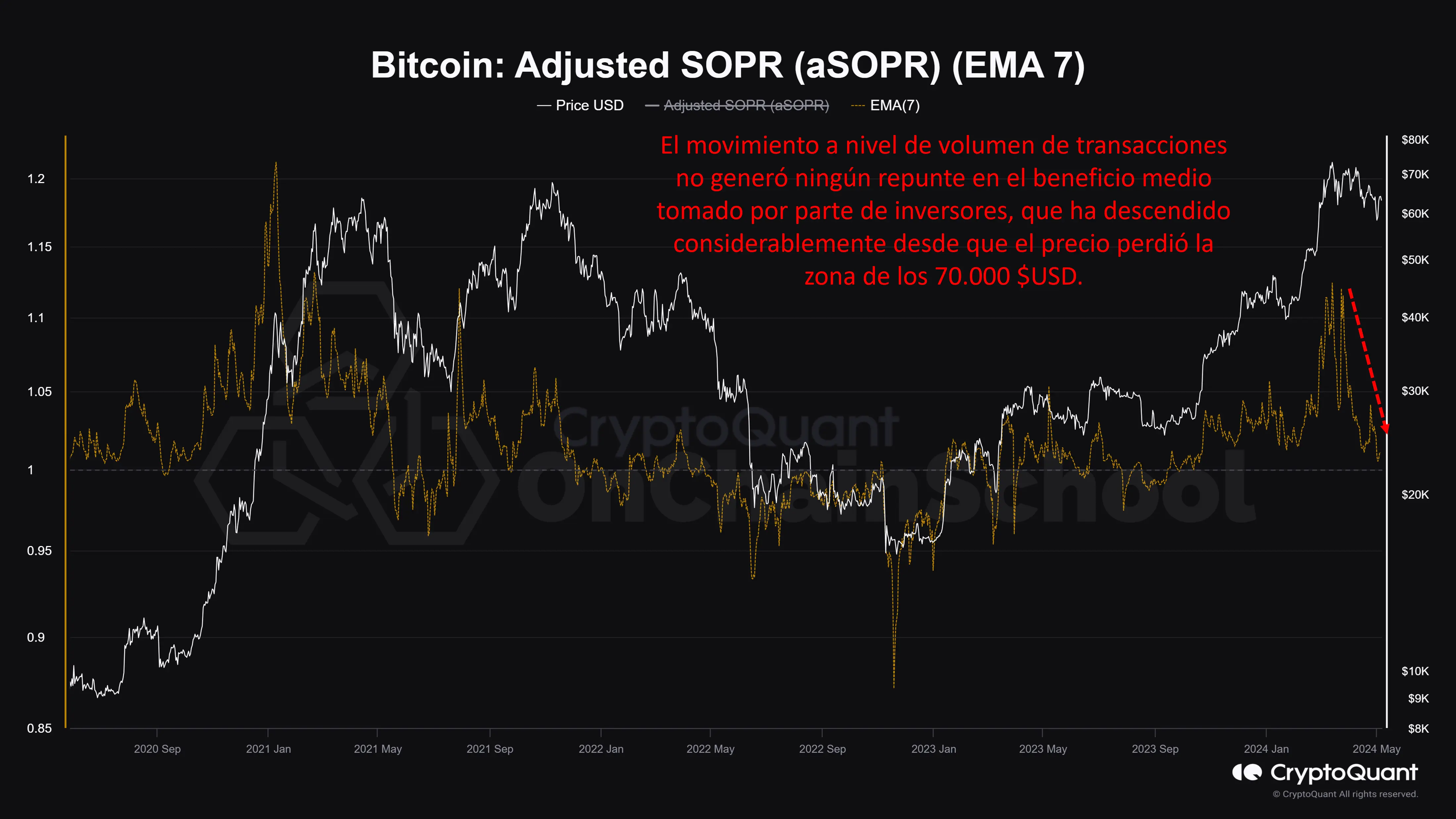 A su vez, el incremento en transacciones tampoco impactó en el beneficio medio que los inversores están efectuando en este momento, que se acerca al nivel de break-even tras la pérdida de los 70.000 $USD.
